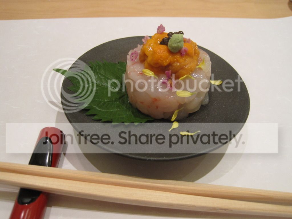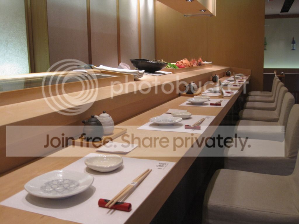 老公去年曾到此餐廳, 食完之後話食到海洋的鮮味, 所以今年一定要帶我來試一試.老公一早就訂好位, 坐在Bar枱的最左面的兩個位. 這個位置, 對正餐廳的主廚; 由他直接發扳和製作壽司.